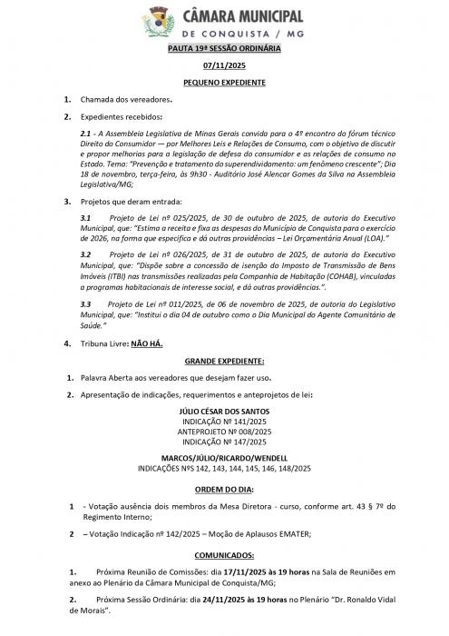 Acontece amanhã sexta-feira, dia 07/11 no Plenário Dr. Ronaldo Vidal de Morais, a 19ª Sessão Ordinária da Câmara Municipal de Conquista, às 19h. Confira a pauta no anexo abaixo. A sessão será trasmitida ao vivo pelo Facebook e pelo canal do YouTube.