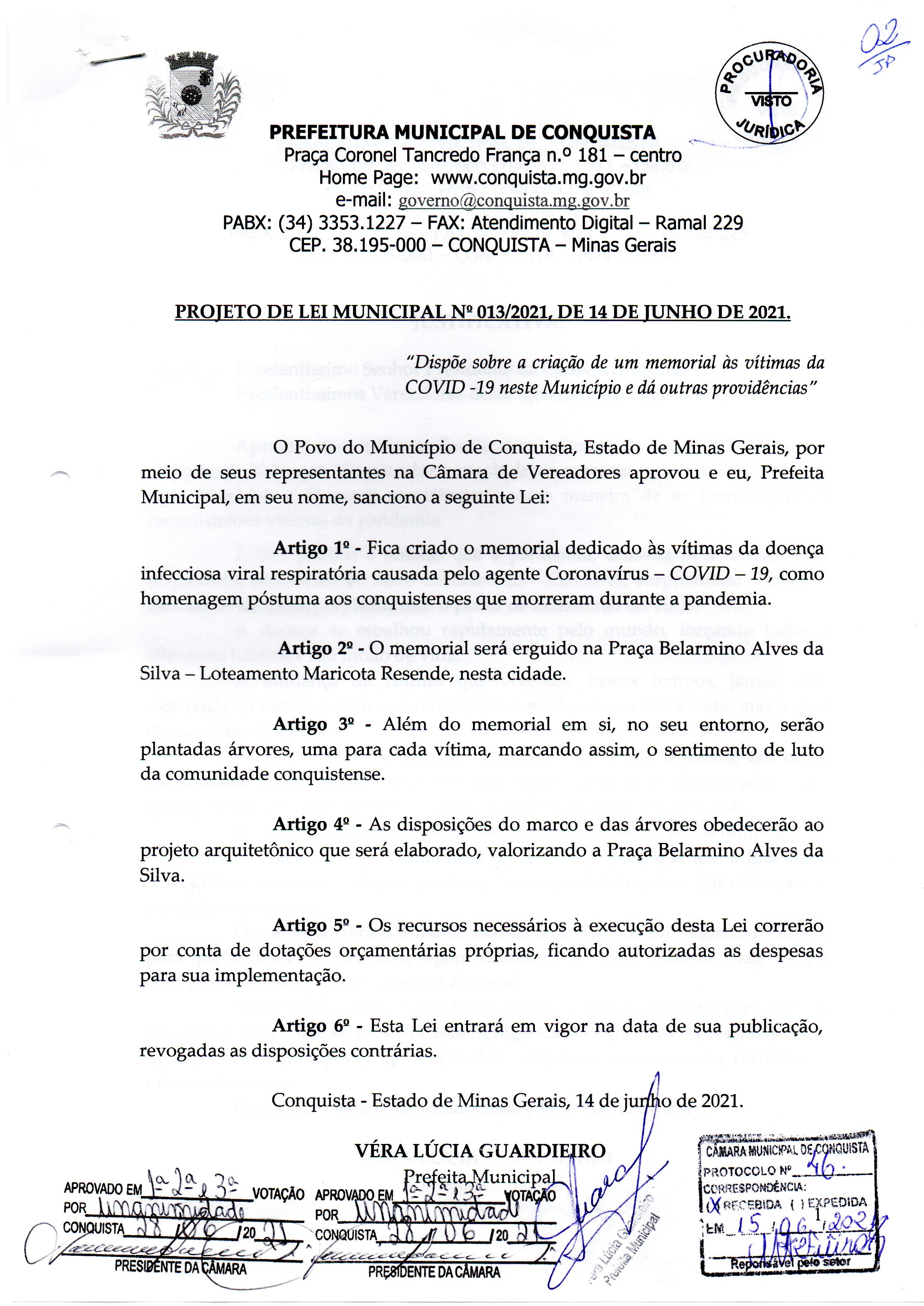 Projeto de Lei: projeto_de_lei_no013-2021_-_dispoe_sobre_a_criacao_de_um_memorial.jpg "Dispõe sobre a criação de um memorial às vítimas da COVID-19 neste Município e dá outras providências". Votação ao Projeto de LeiVereadores que votaram À FAVORTúlio Moreira dos ReisJúnio César de Oliveira