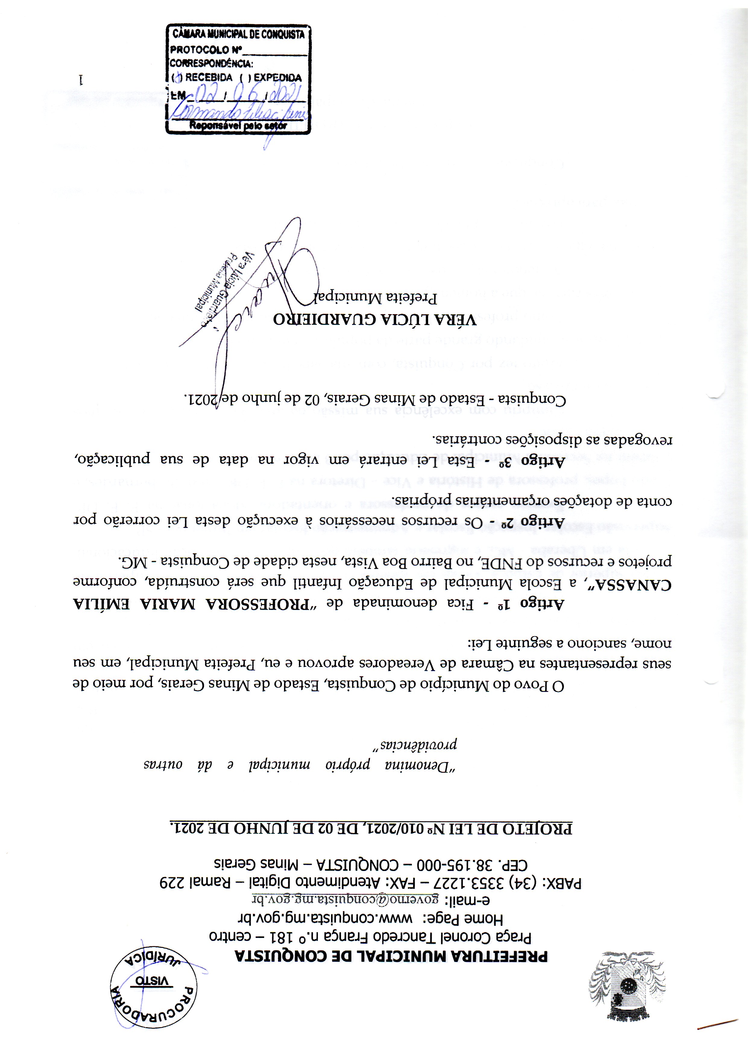 Projeto de Lei: projeto_de_lei_no_010_-_2021_-_denomina_professora_maria_emilia_canassa.jpg EMENTA: "Dá denominação a Área Institucional de bem Público que menciona e especifica, e dá outras providências". Votação ao Projeto de LeiVereadores que votaram À FAVORJúnio César de Oliveira