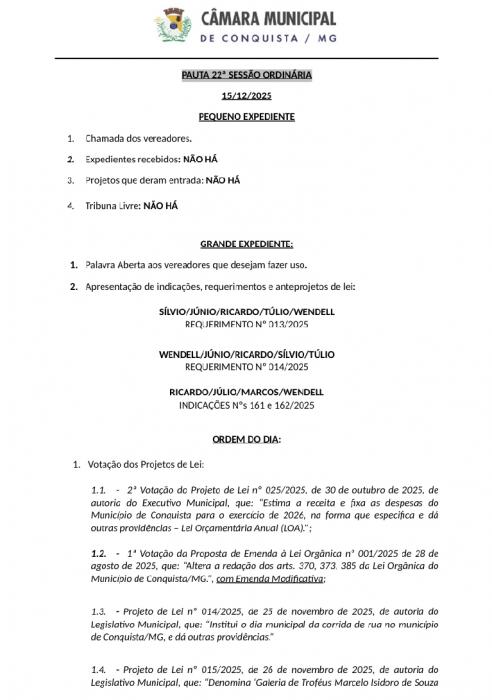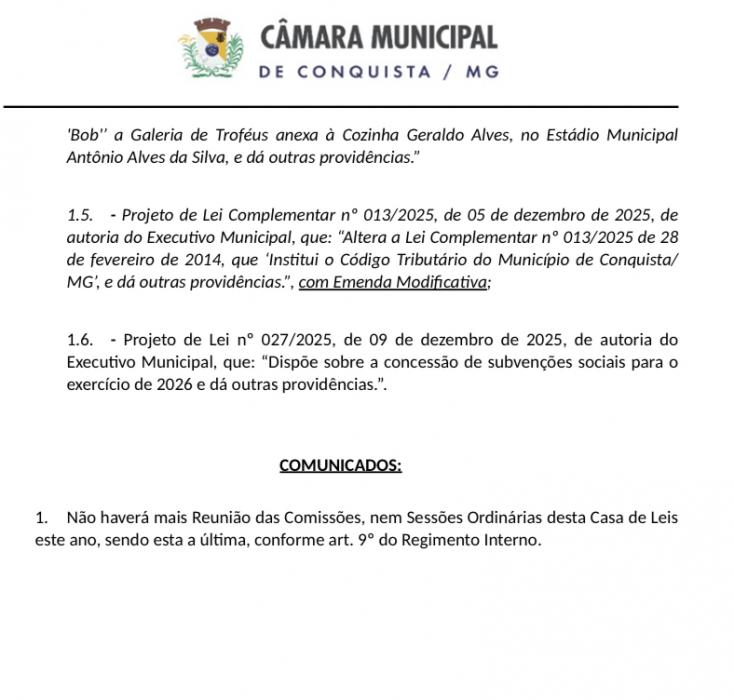 A última sessão do ano será realizada nesta segunda -feira, dia 15 de dezembro, às 19h.