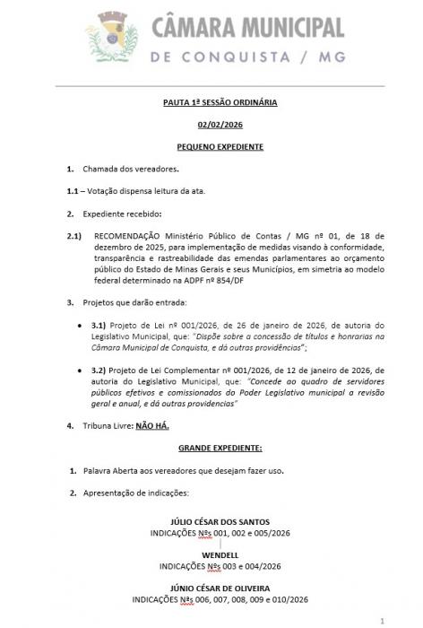A Câmara Municipal de Conquista convida toda a população para participar da 1ª Sessão Ordinária de 2026, que será realizada na próxima segunda-feira, às 19h, no Plenário da Câmara.