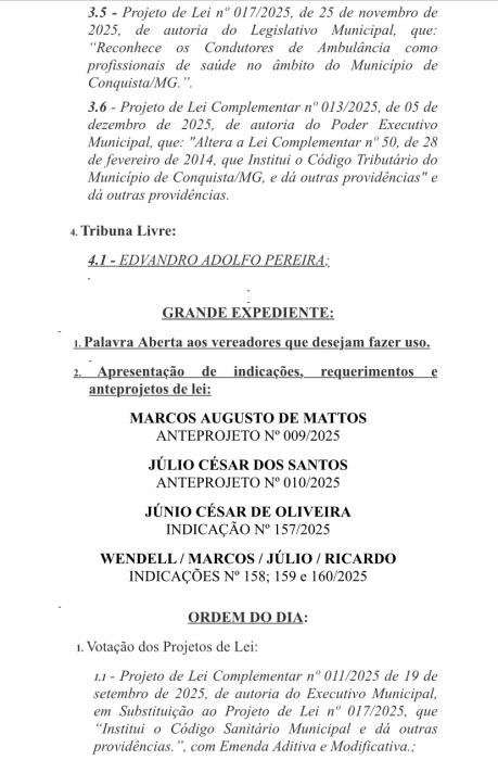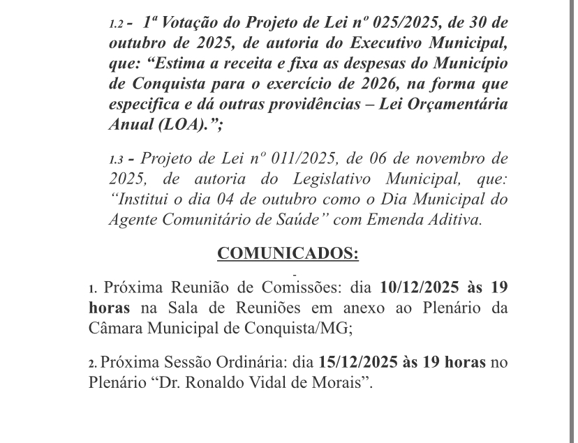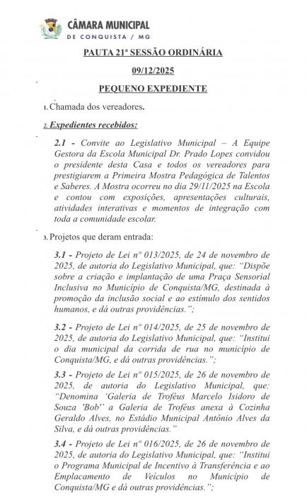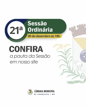 A Sessão Ordinária que aconteceria amanhã (segunda-feira)foi transferida devido ao ponto facultativo em homenagem ao Dia de Nossa Senhora da Conceição, adotado pelo Município de Conquista.