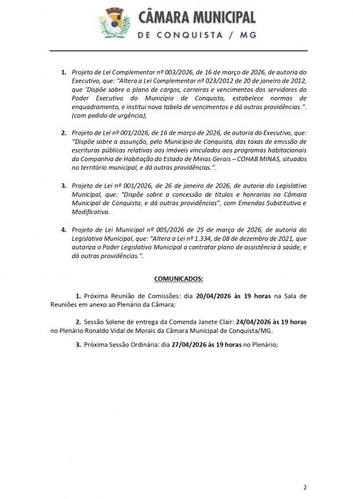 Câmara Municipal de Conquista convida toda a população para participar da 6ª Sessão Ordinária de 2026, que será realizada na próxima segunda-feira (13/04/2026), às 19h, no Plenário da Câmara.